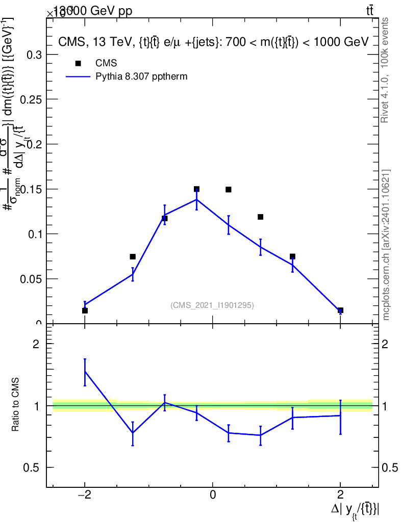 Lines: data, pythia8 8.307 pptherm |