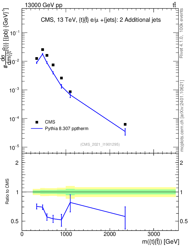 Lines: data, pythia8 8.307 pptherm |