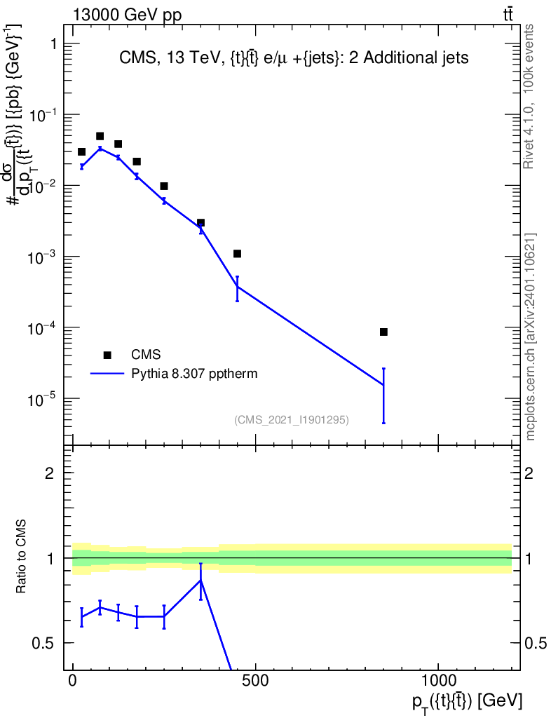 Lines: data, pythia8 8.307 pptherm |