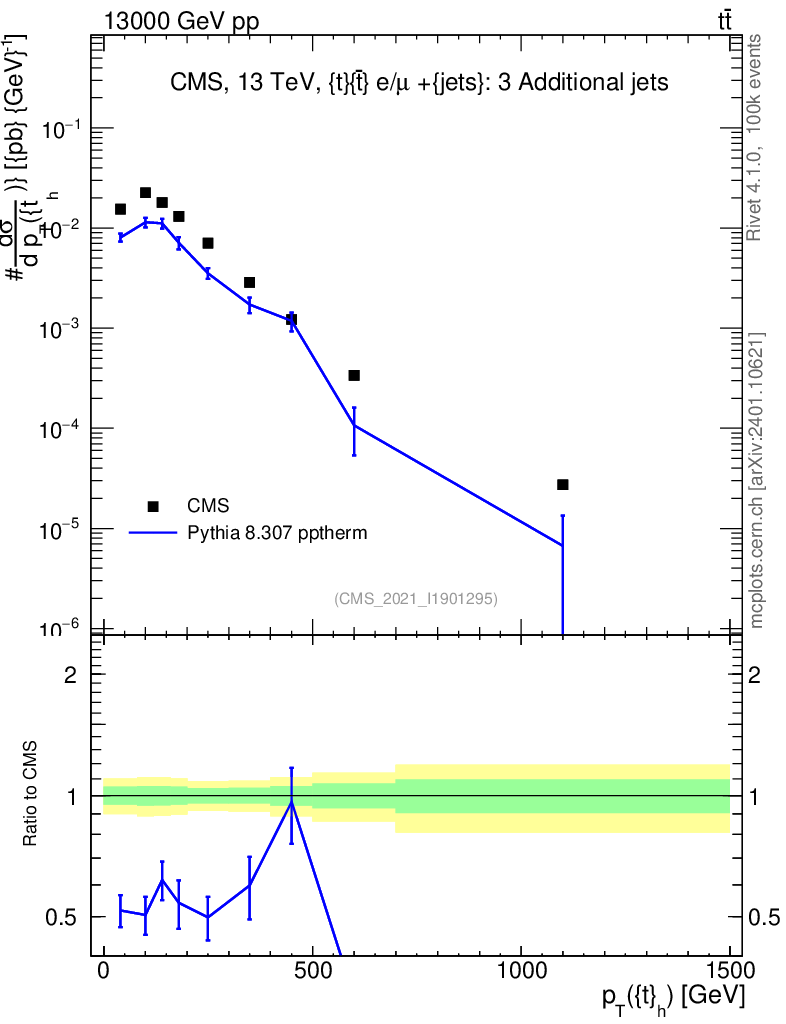 Lines: data, pythia8 8.307 pptherm |