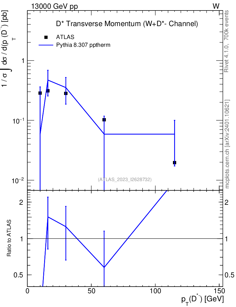 Lines: data, pythia8 8.307 pptherm |