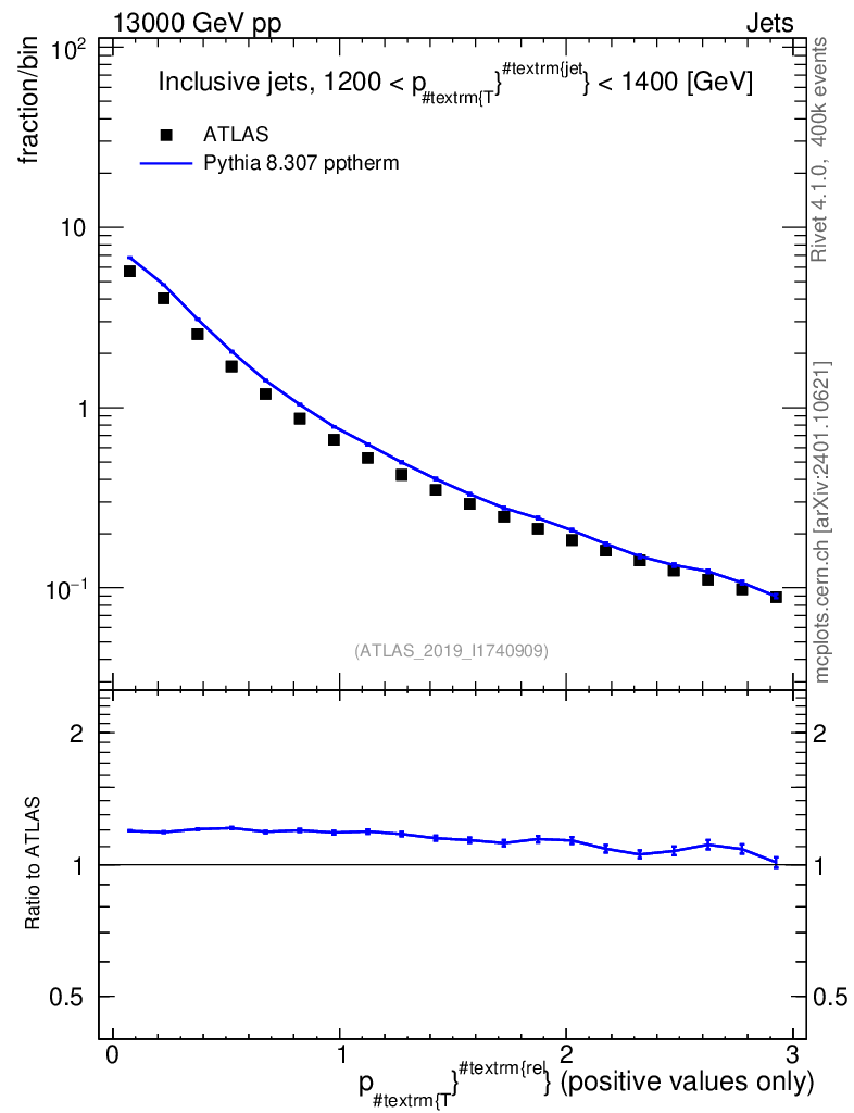 Lines: data, pythia8 8.307 pptherm |