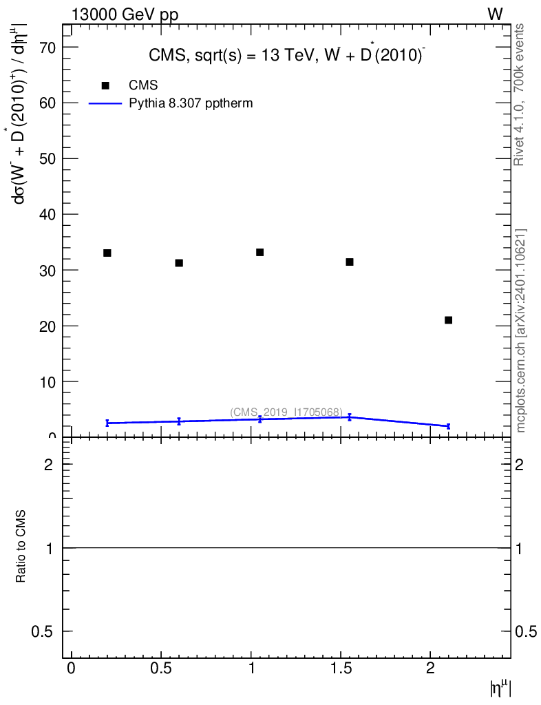 Lines: data, pythia8 8.307 pptherm |