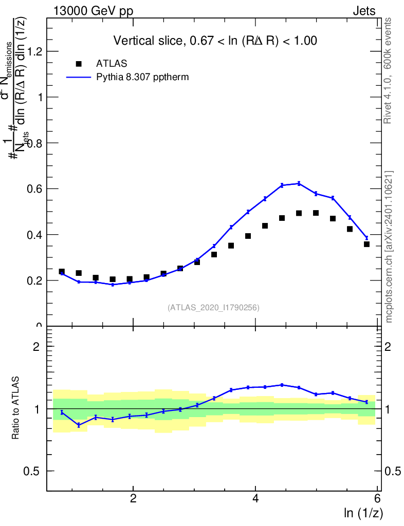 Lines: data, pythia8 8.307 pptherm |