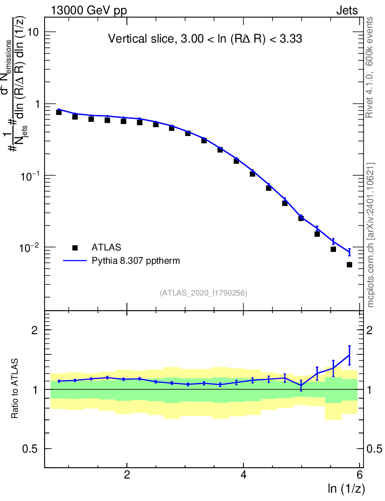 Lines: data, pythia8 8.307 pptherm |