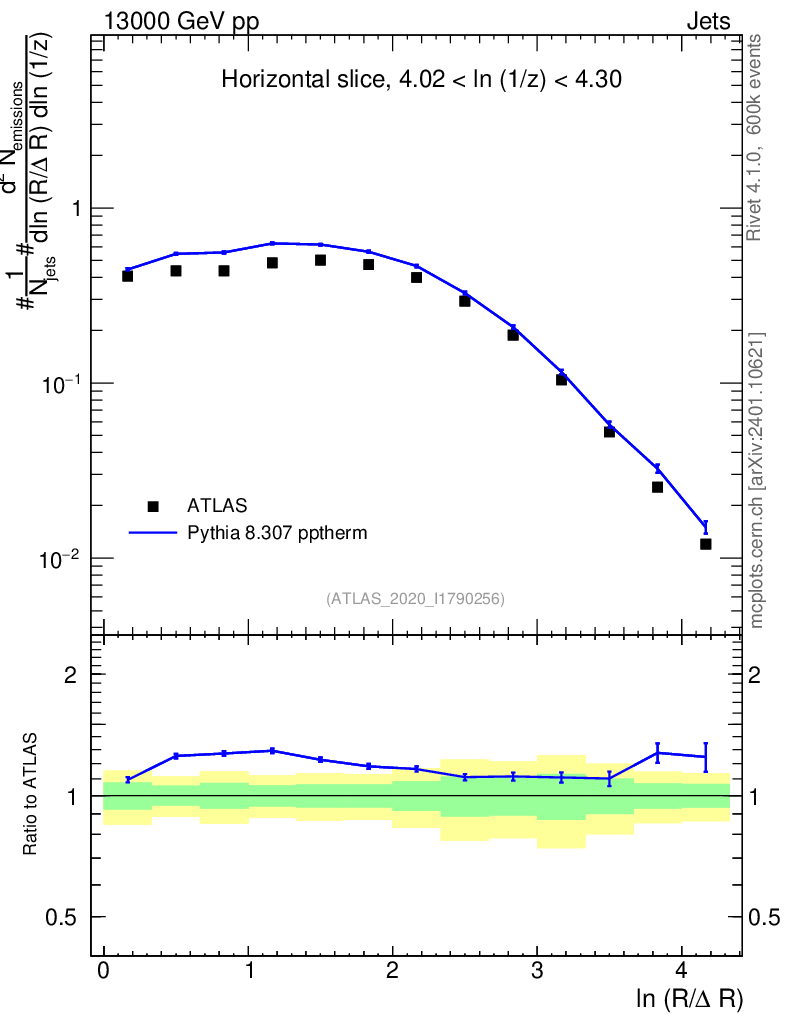 Lines: data, pythia8 8.307 pptherm |