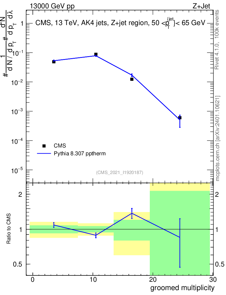 Lines: data, pythia8 8.307 pptherm |