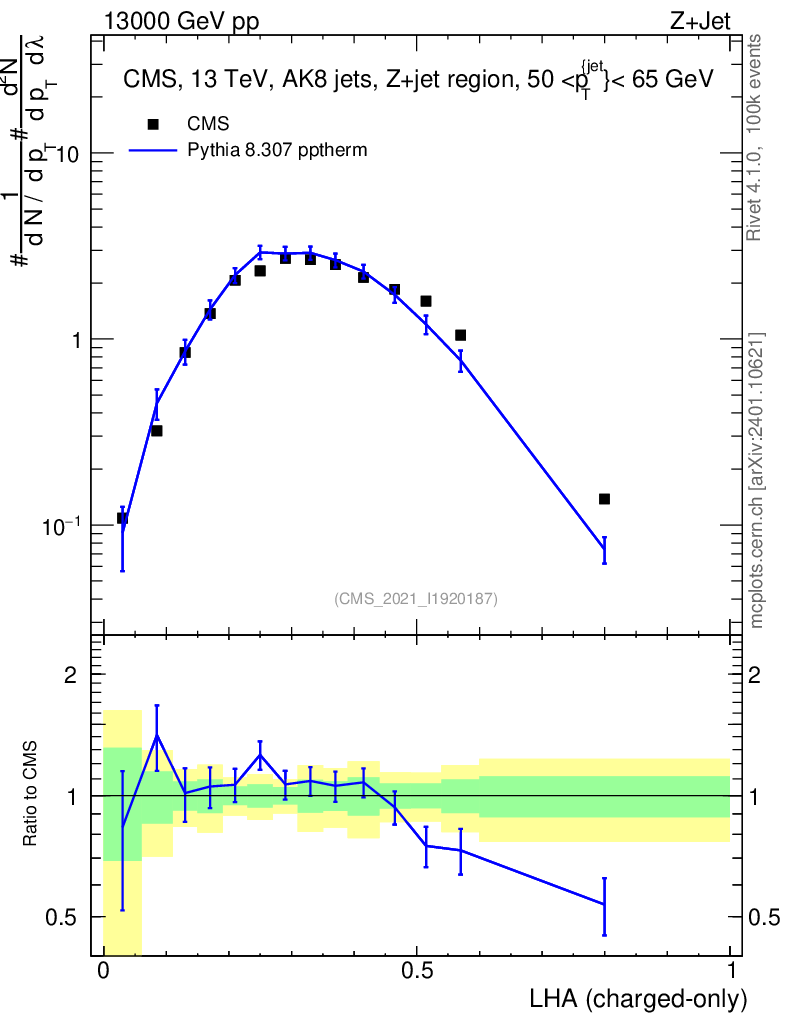 Lines: data, pythia8 8.307 pptherm |