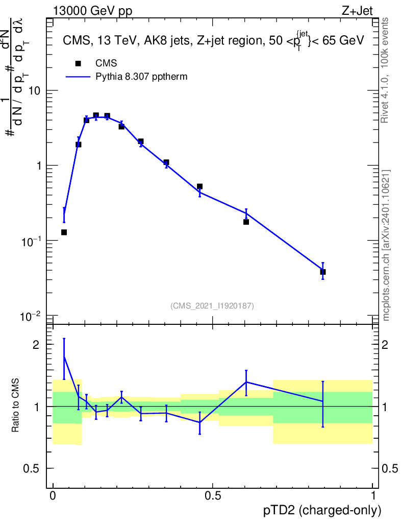 Lines: data, pythia8 8.307 pptherm |