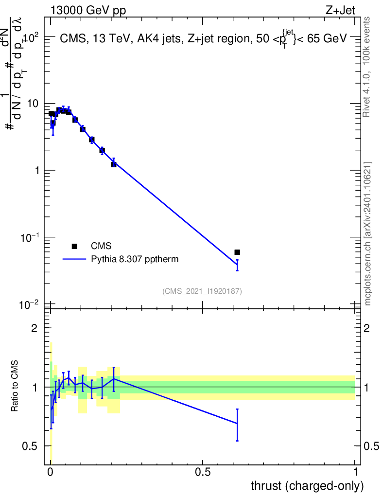 Lines: data, pythia8 8.307 pptherm |