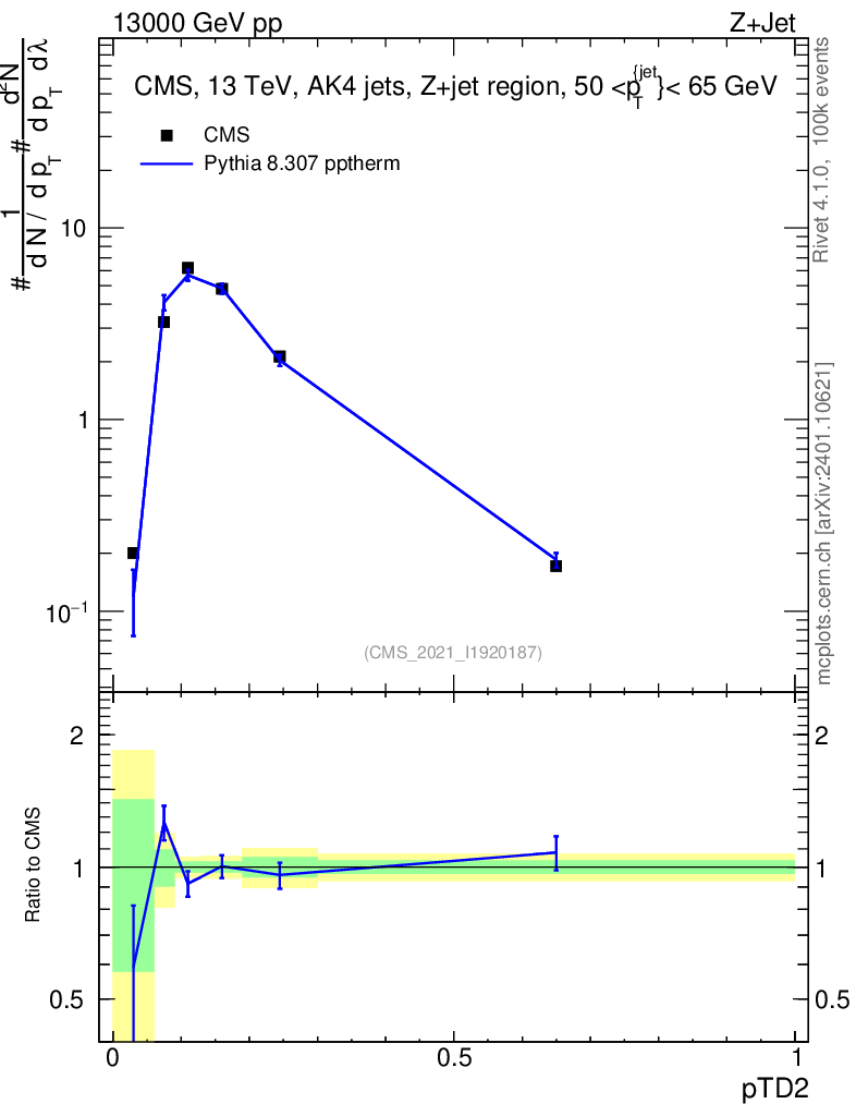 Lines: data, pythia8 8.307 pptherm |