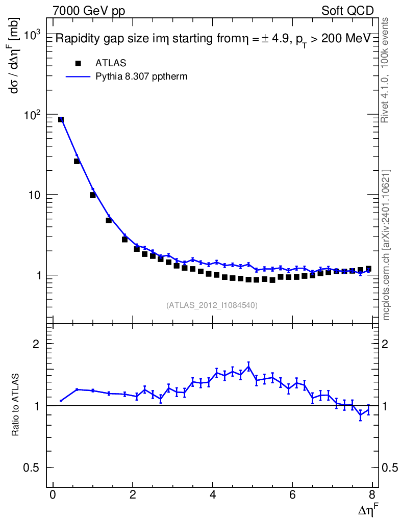 Lines: data, pythia8 8.307 pptherm |