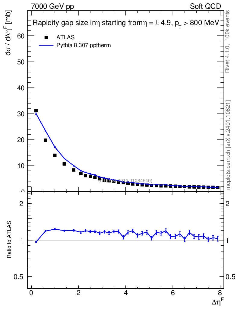 Lines: data, pythia8 8.307 pptherm |