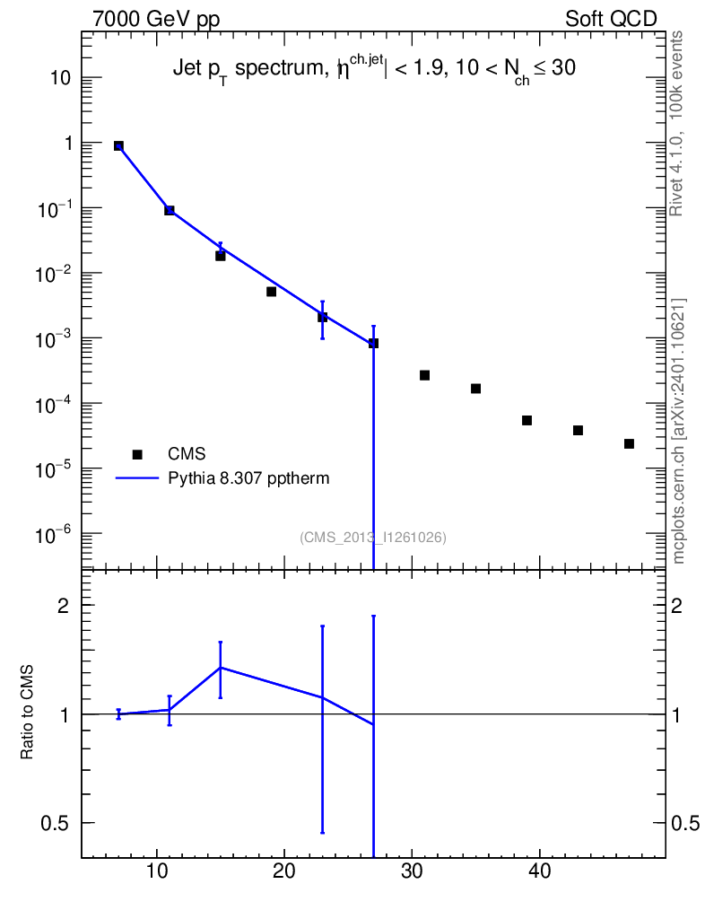 Lines: data, pythia8 8.307 pptherm |