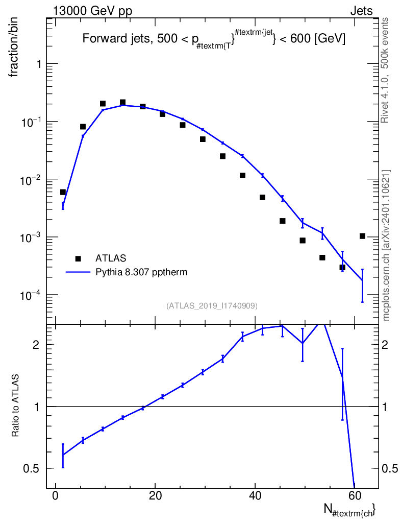 Lines: data, pythia8 8.307 pptherm |