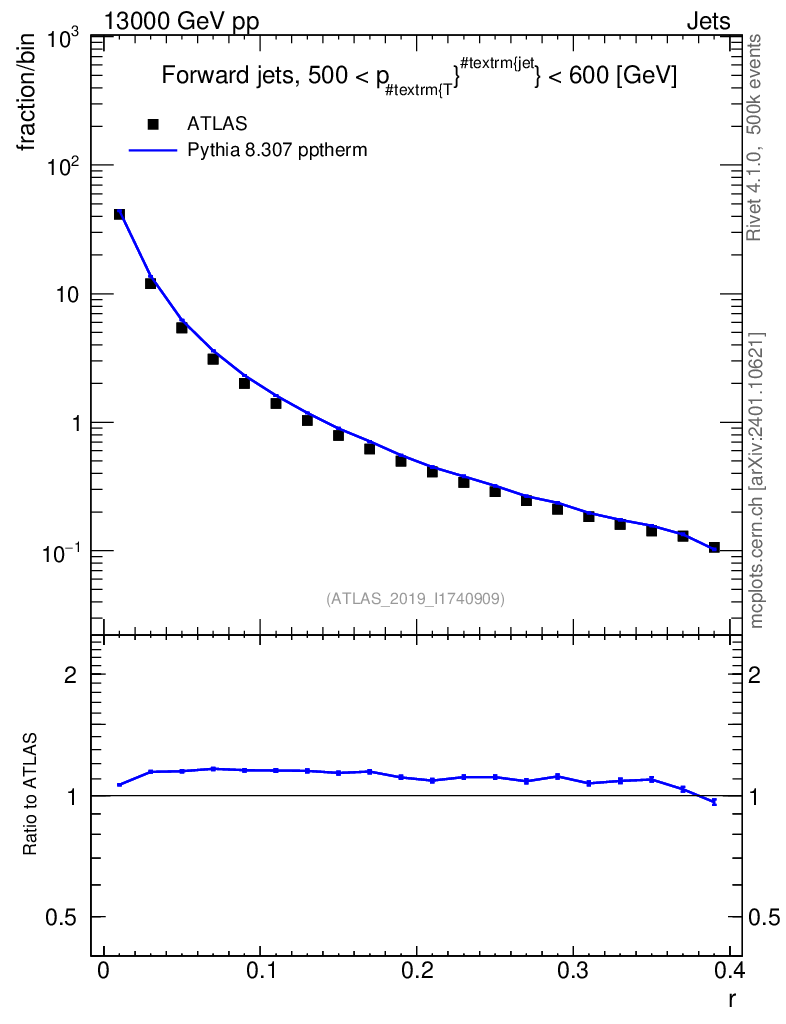 Lines: data, pythia8 8.307 pptherm |