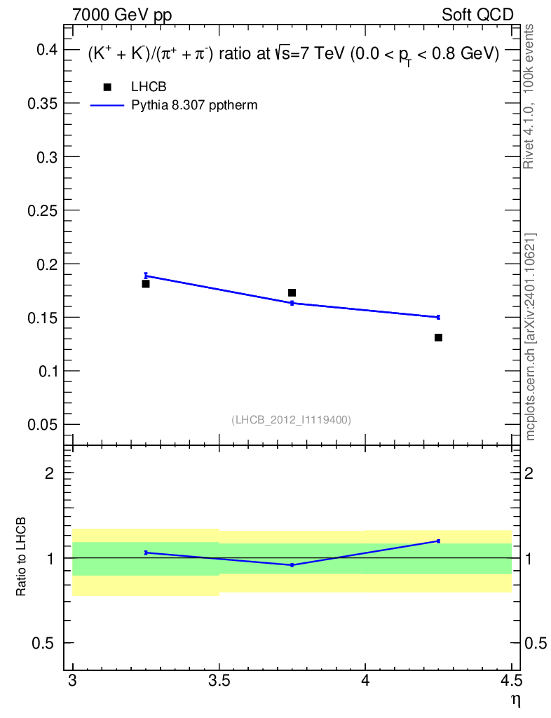 Lines: data, pythia8 8.307 pptherm |