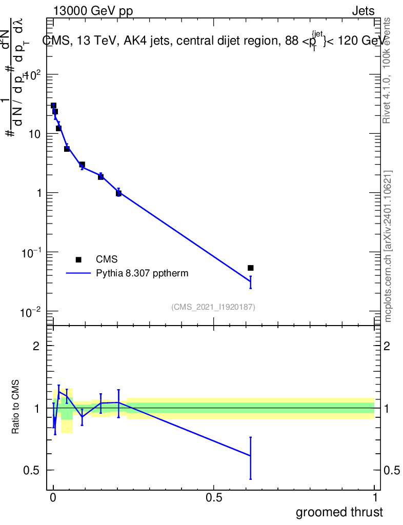 Lines: data, pythia8 8.307 pptherm |