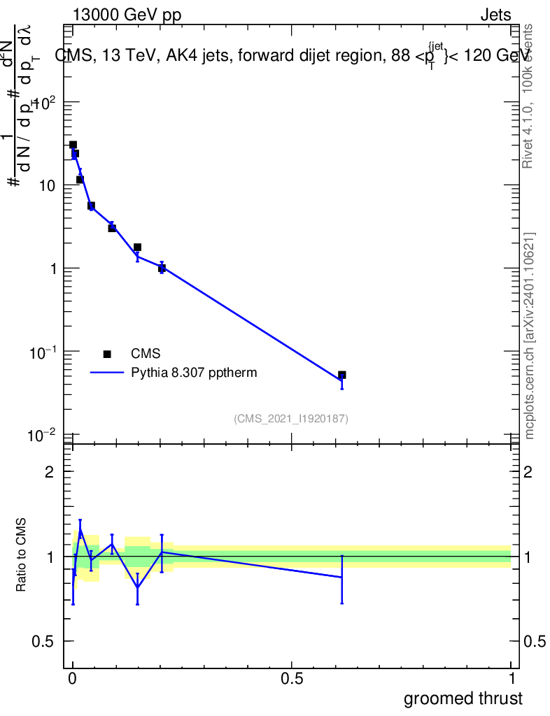 Lines: data, pythia8 8.307 pptherm |