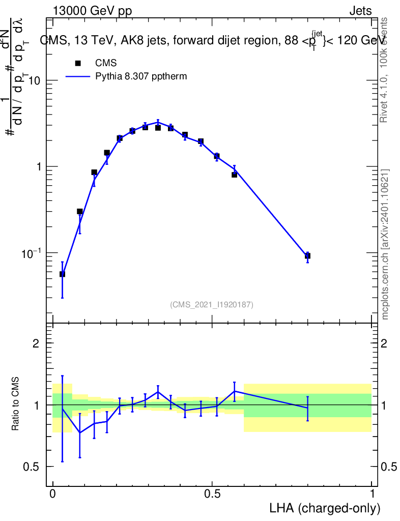 Lines: data, pythia8 8.307 pptherm |