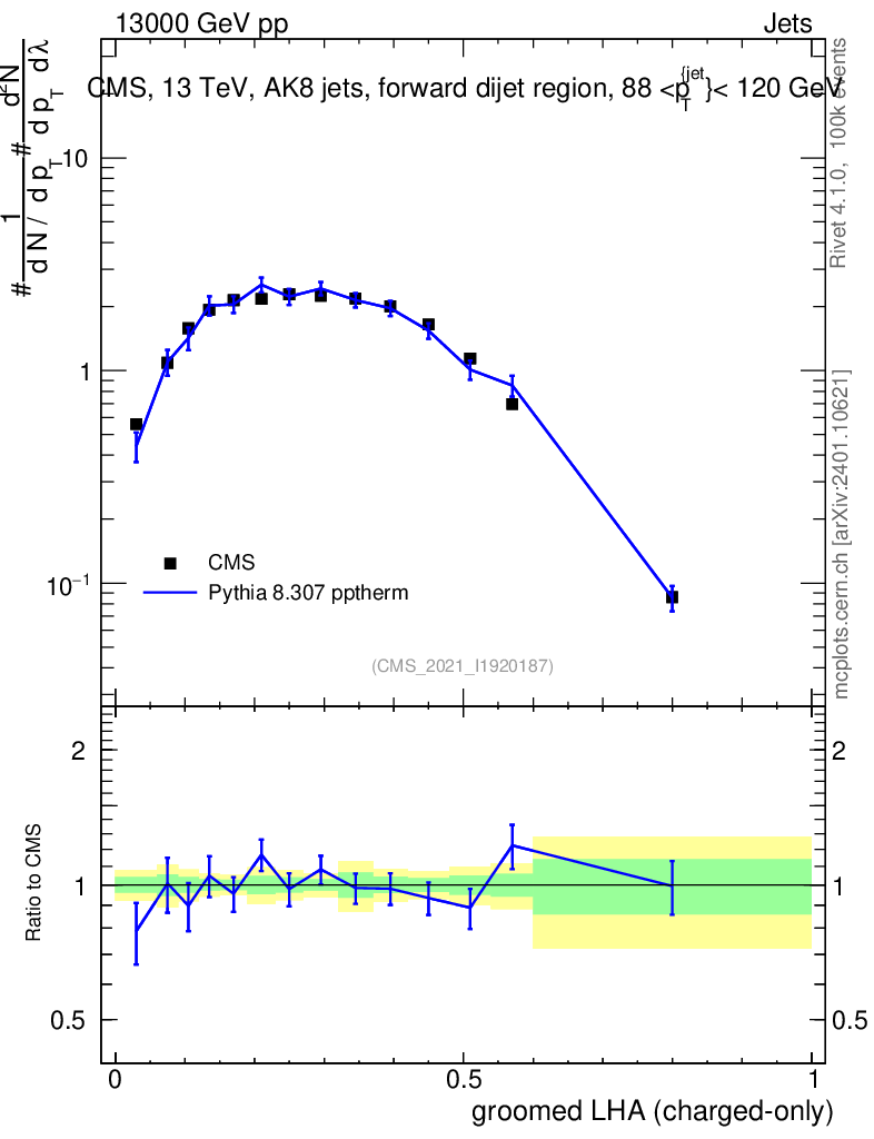 Lines: data, pythia8 8.307 pptherm |