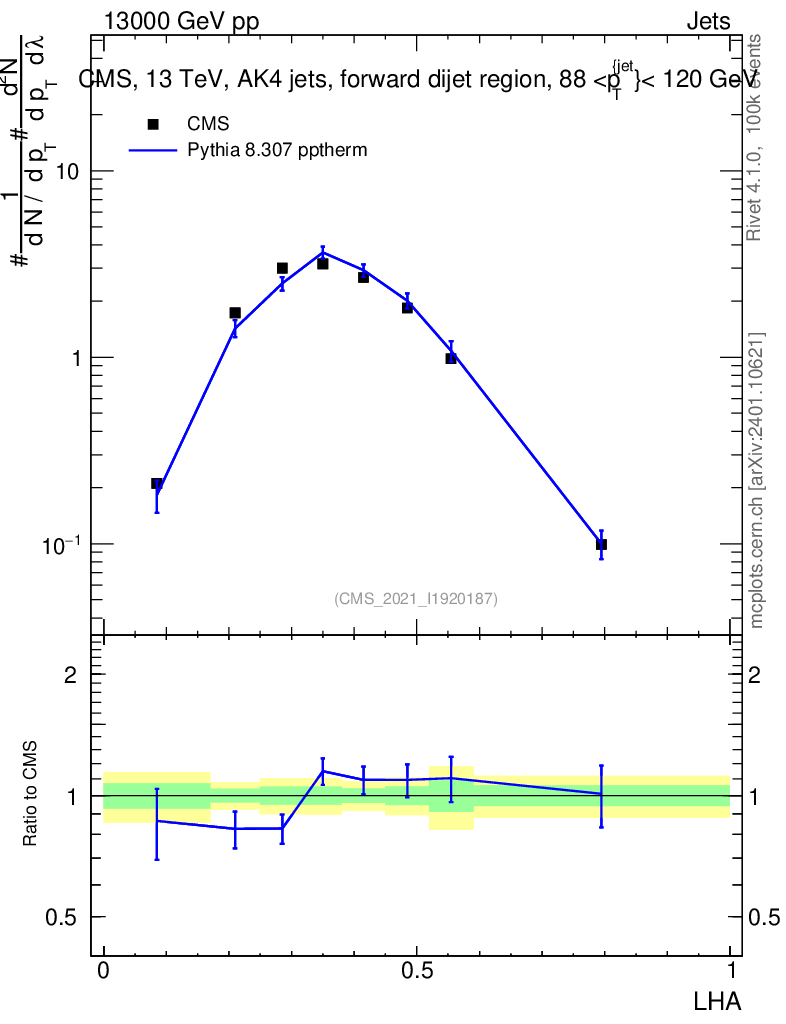 Lines: data, pythia8 8.307 pptherm |
