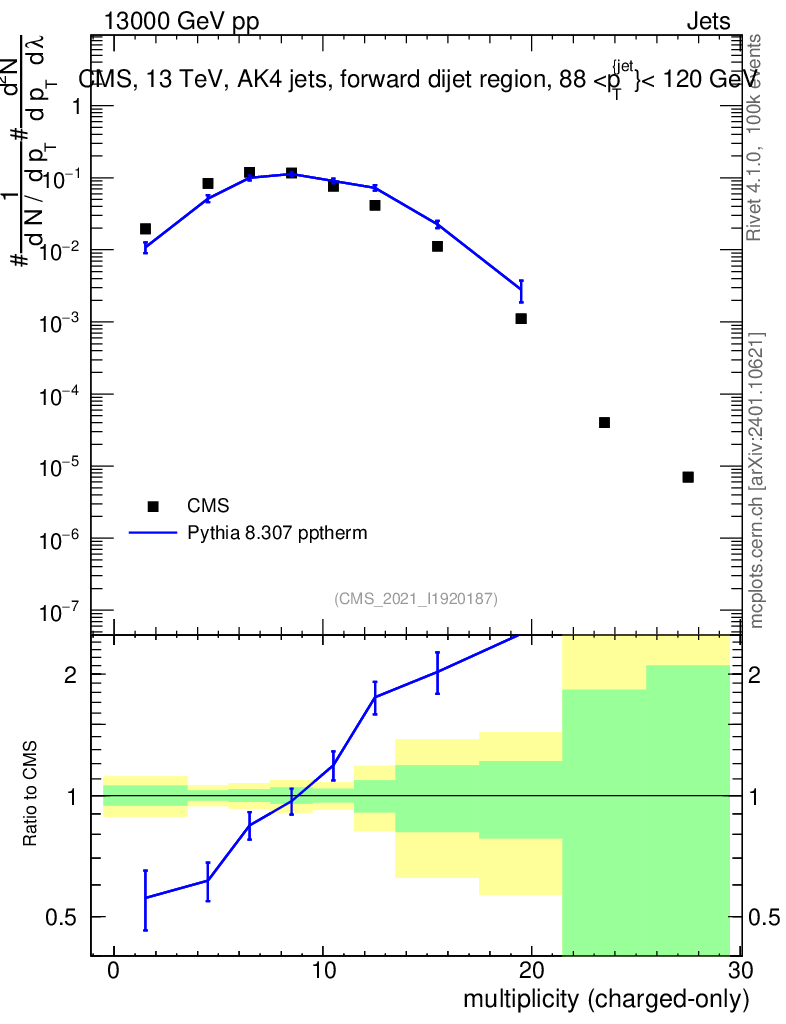 Lines: data, pythia8 8.307 pptherm |