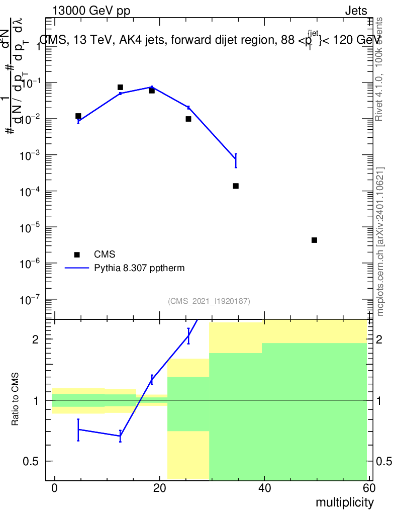 Lines: data, pythia8 8.307 pptherm |