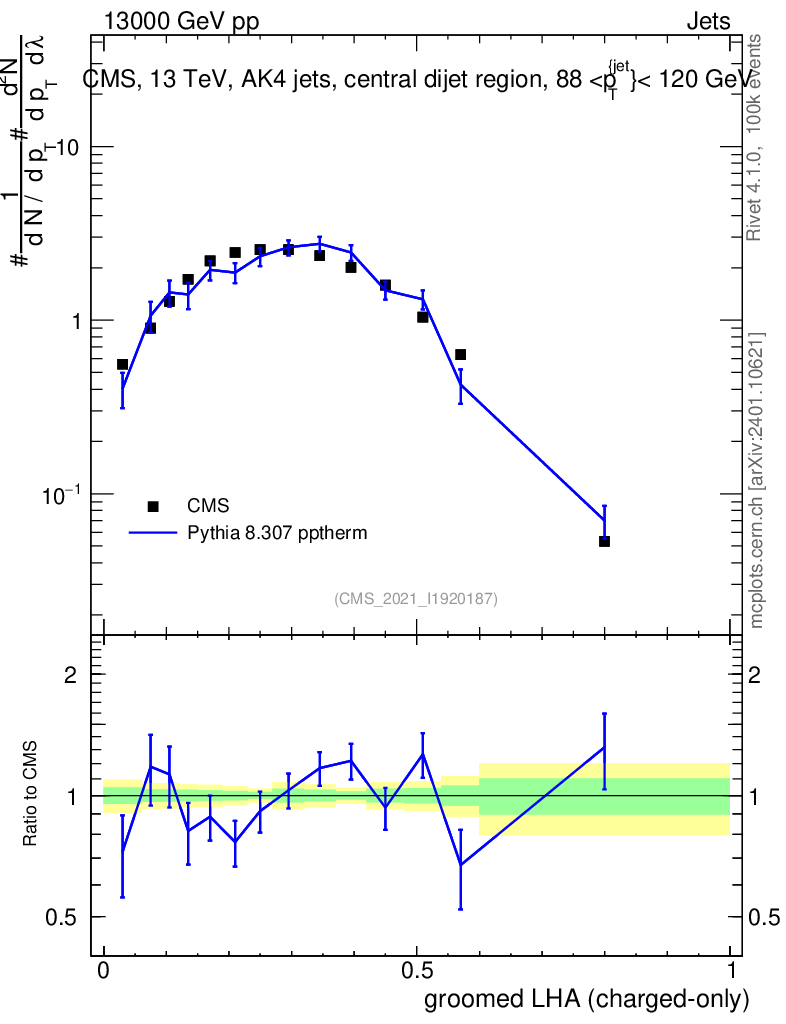 Lines: data, pythia8 8.307 pptherm |