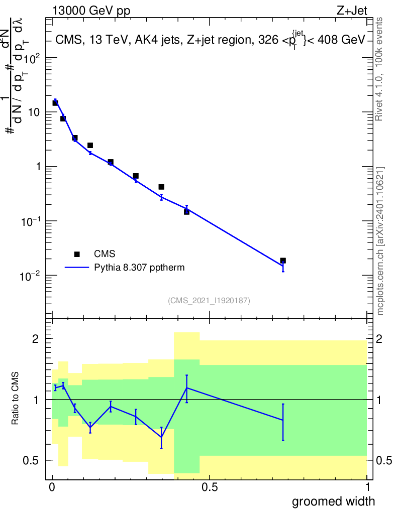 Lines: data, pythia8 8.307 pptherm |
