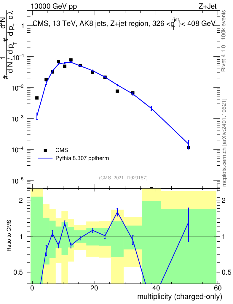 Lines: data, pythia8 8.307 pptherm |