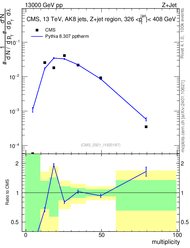 Lines: data, pythia8 8.307 pptherm |