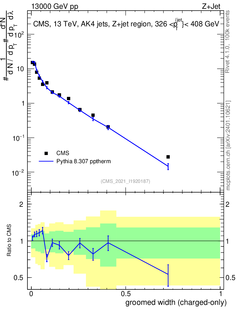 Lines: data, pythia8 8.307 pptherm |