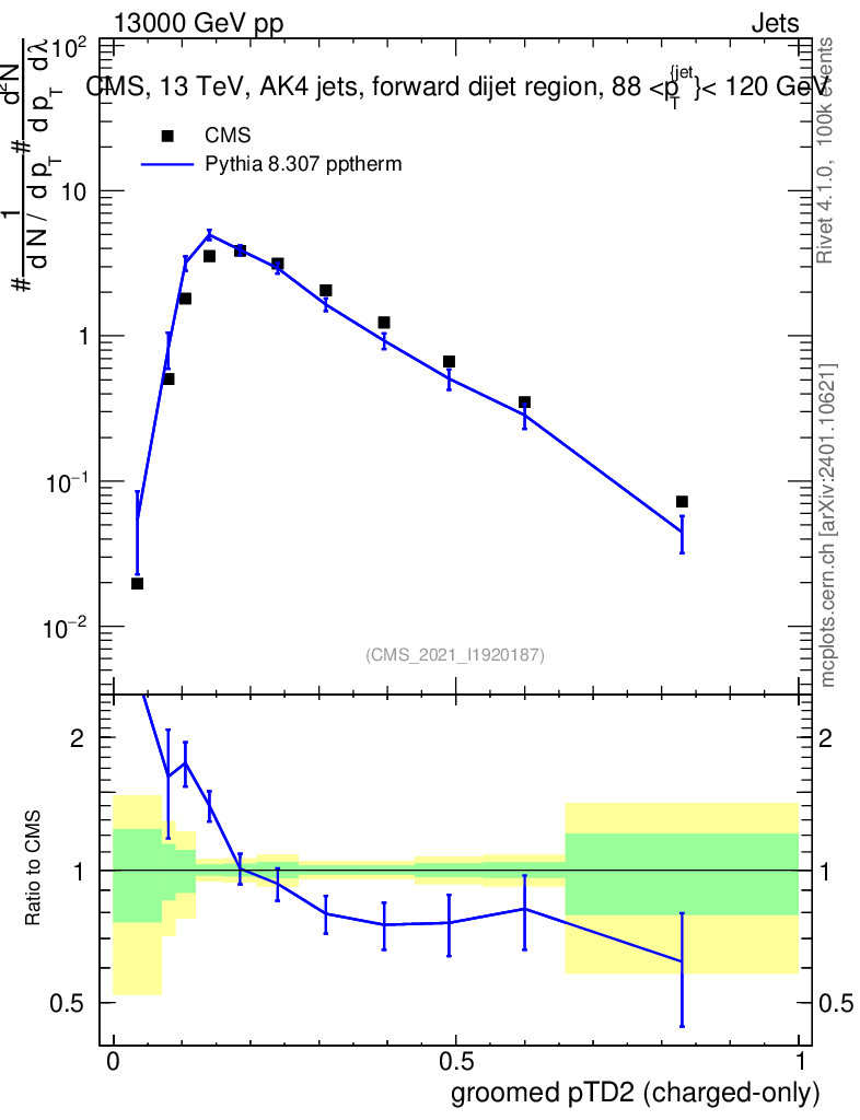 Lines: data, pythia8 8.307 pptherm |