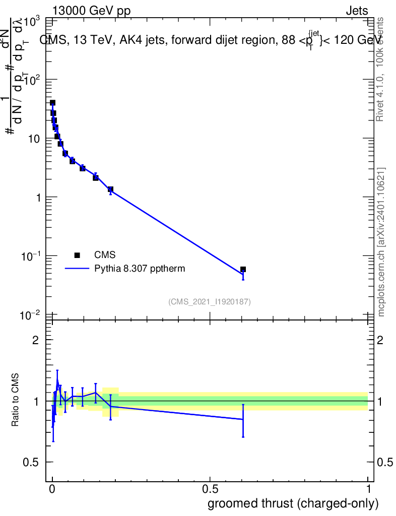 Lines: data, pythia8 8.307 pptherm |