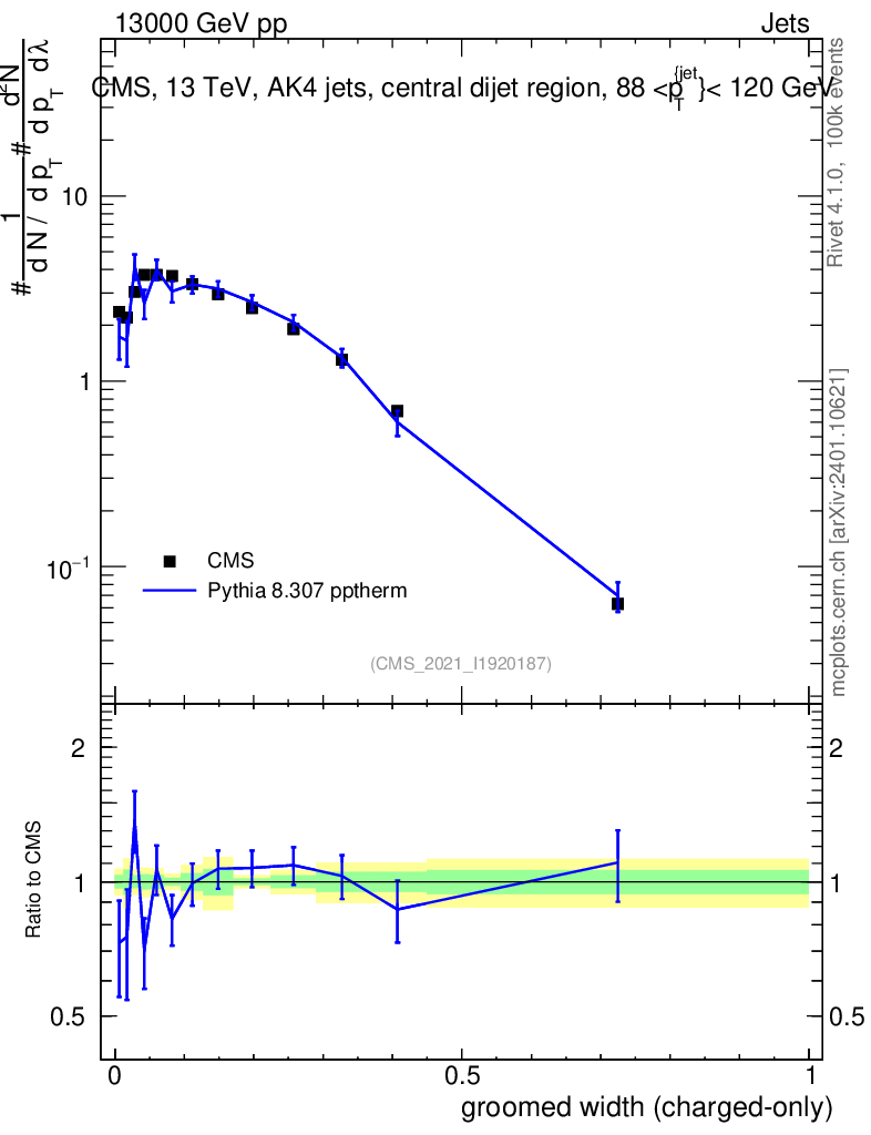 Lines: data, pythia8 8.307 pptherm |