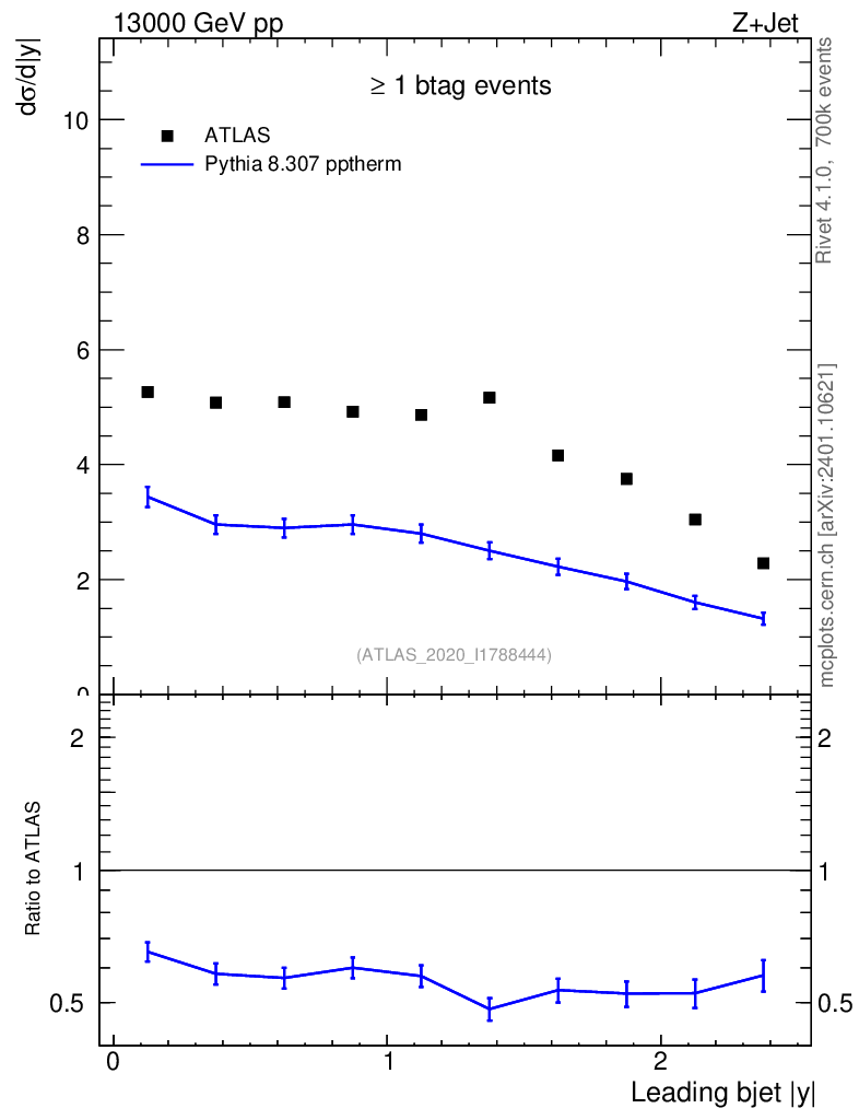 Lines: data, pythia8 8.307 pptherm |
