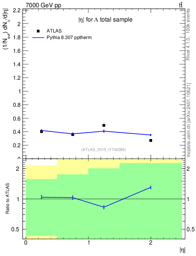 Lines: data, pythia8 8.307 pptherm |