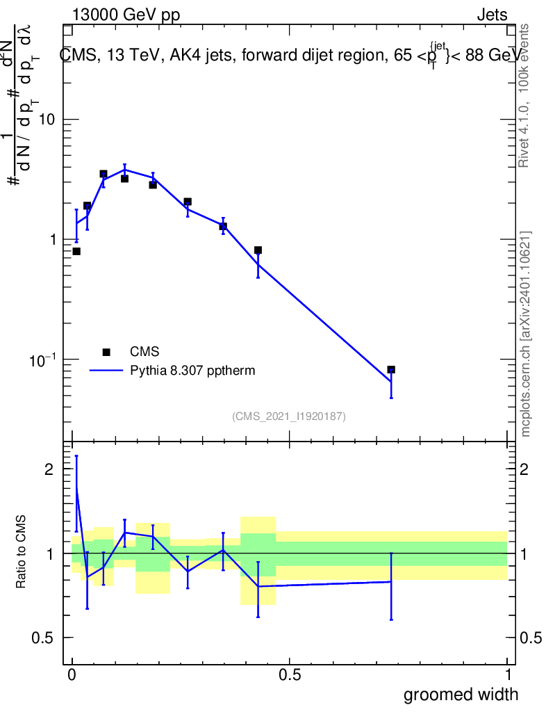 Lines: data, pythia8 8.307 pptherm |
