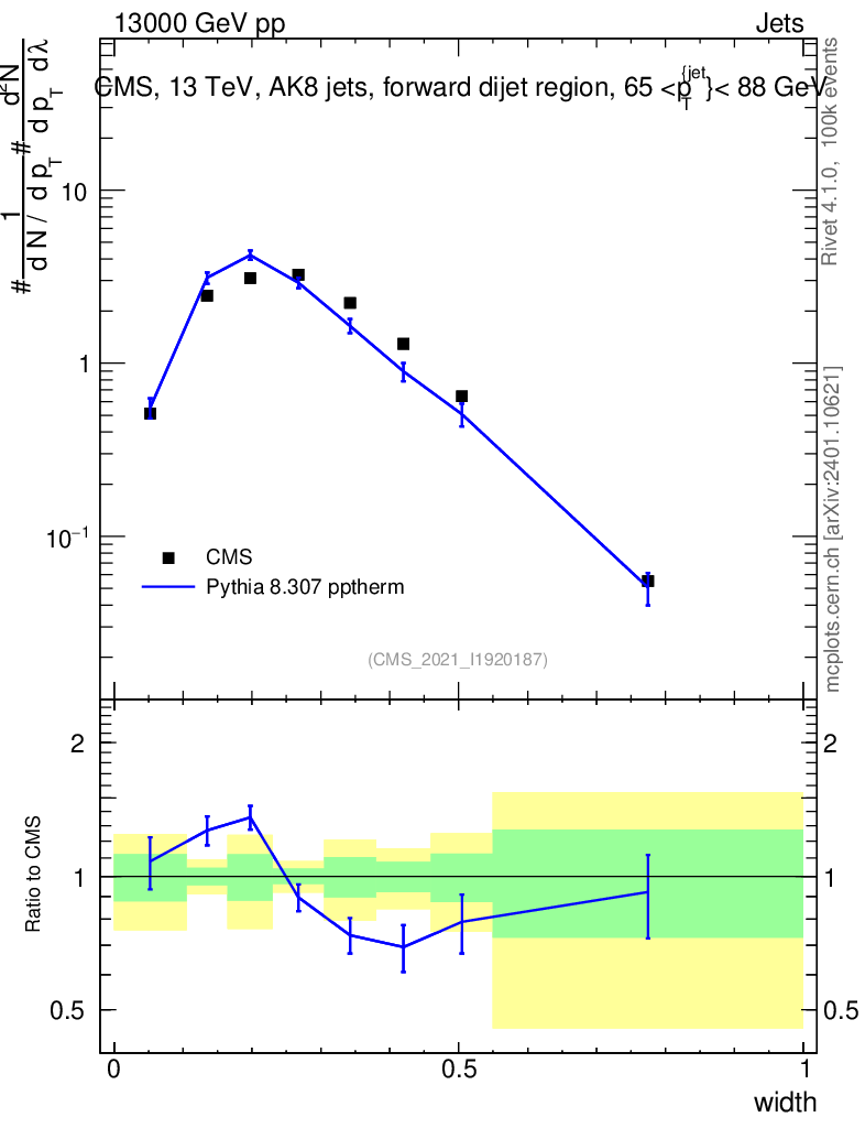 Lines: data, pythia8 8.307 pptherm |