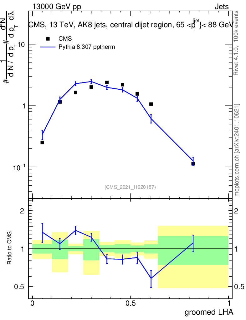 Lines: data, pythia8 8.307 pptherm |