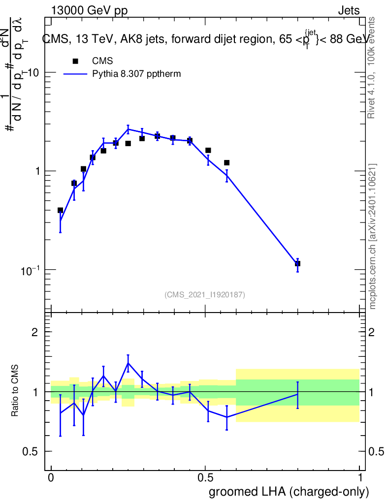 Lines: data, pythia8 8.307 pptherm |