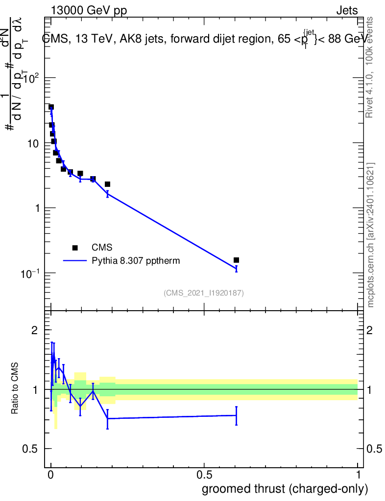 Lines: data, pythia8 8.307 pptherm |