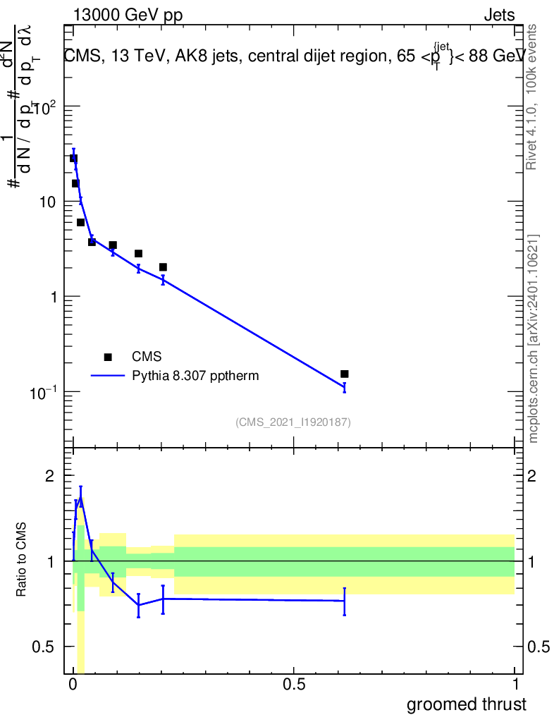 Lines: data, pythia8 8.307 pptherm |