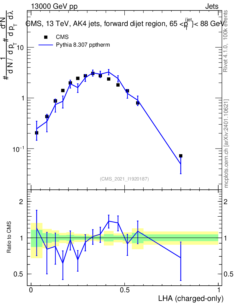 Lines: data, pythia8 8.307 pptherm |