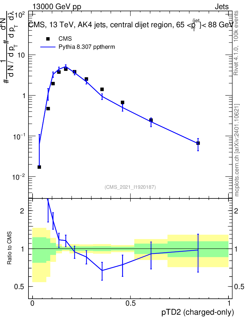 Lines: data, pythia8 8.307 pptherm |