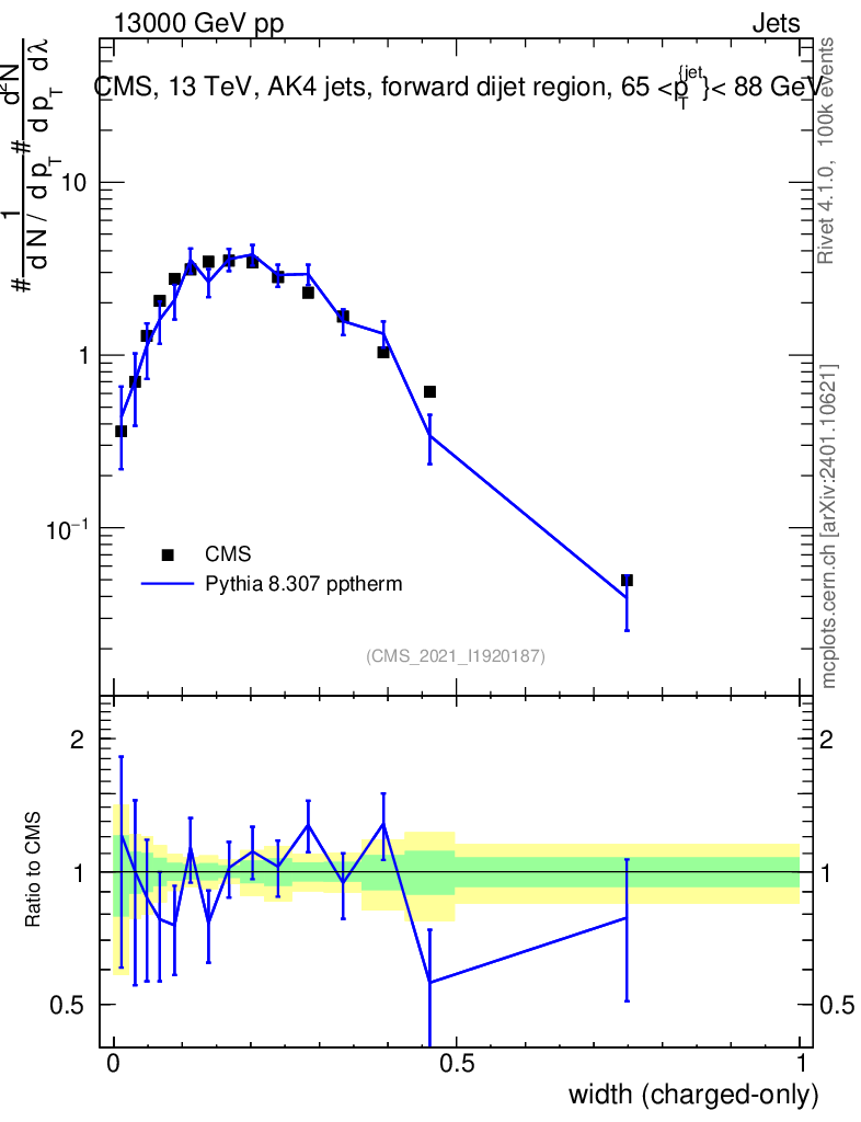 Lines: data, pythia8 8.307 pptherm |