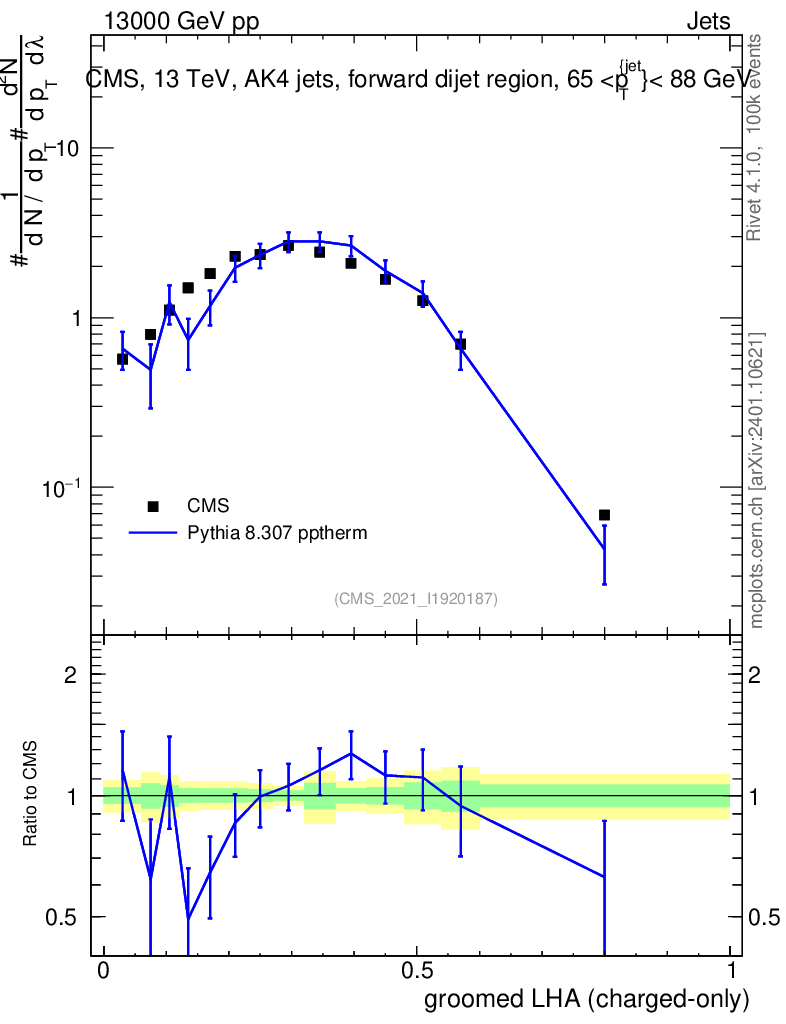 Lines: data, pythia8 8.307 pptherm |