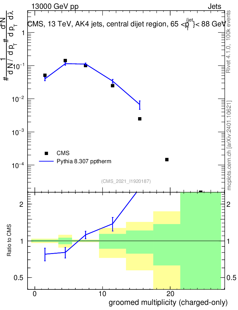 Lines: data, pythia8 8.307 pptherm |