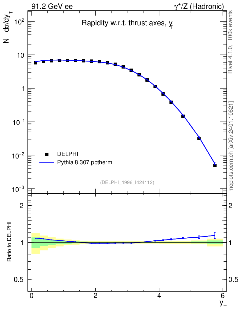 Lines: data, pythia8 8.307 pptherm |